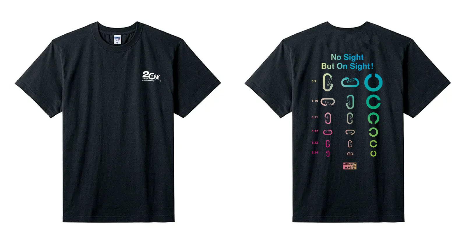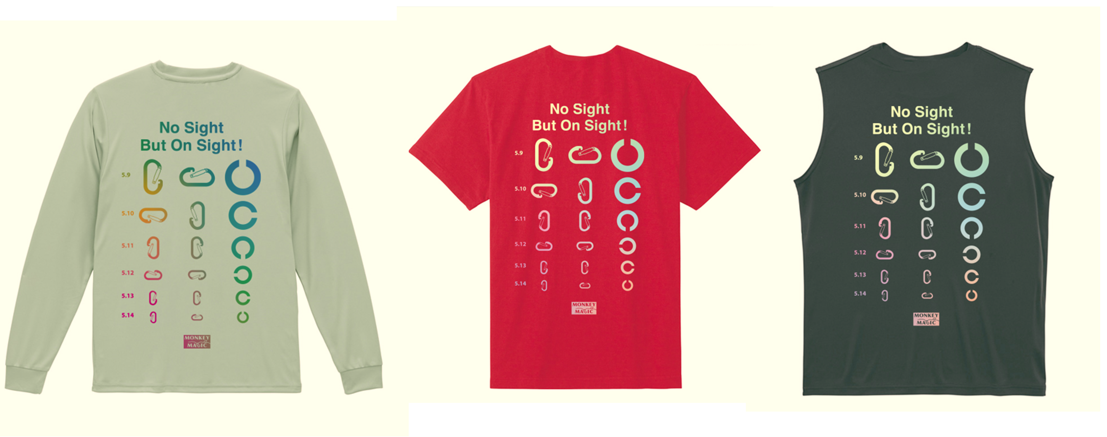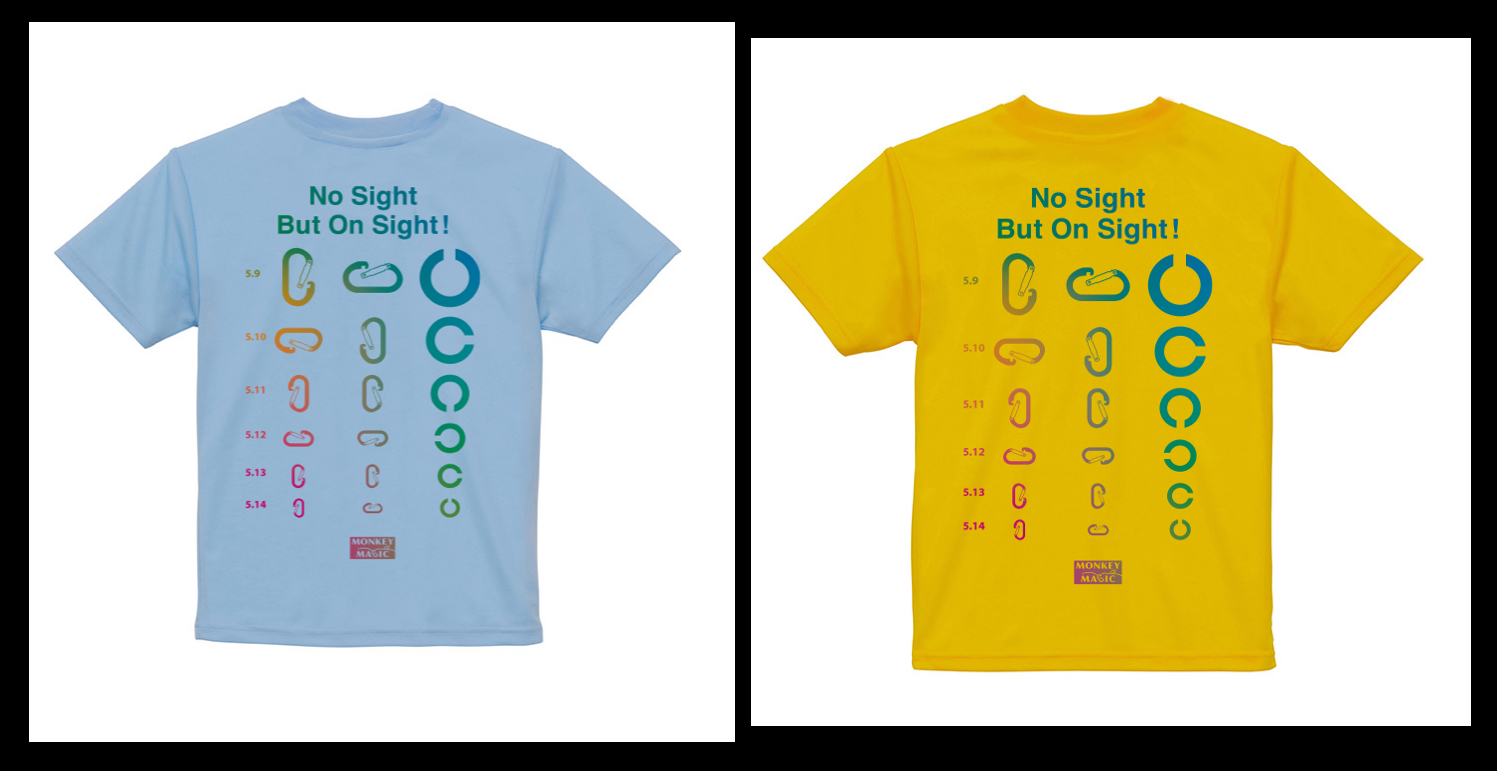 視力検査表をモチーフとして、Cマーク(ランドルト環)とクライミングギアのカラビナが前面にあしらわれ、NPO法人モンキーマジックのスローガン「No Sicht But On Sight!(見えなくても、一回で登り切れる!)」が掲げられているバックプリント。視覚障害者向けのアウトドアスクール事業を設立当初2005年に開始した、活動のルーツである当時のTシャツデザインが基になっています。