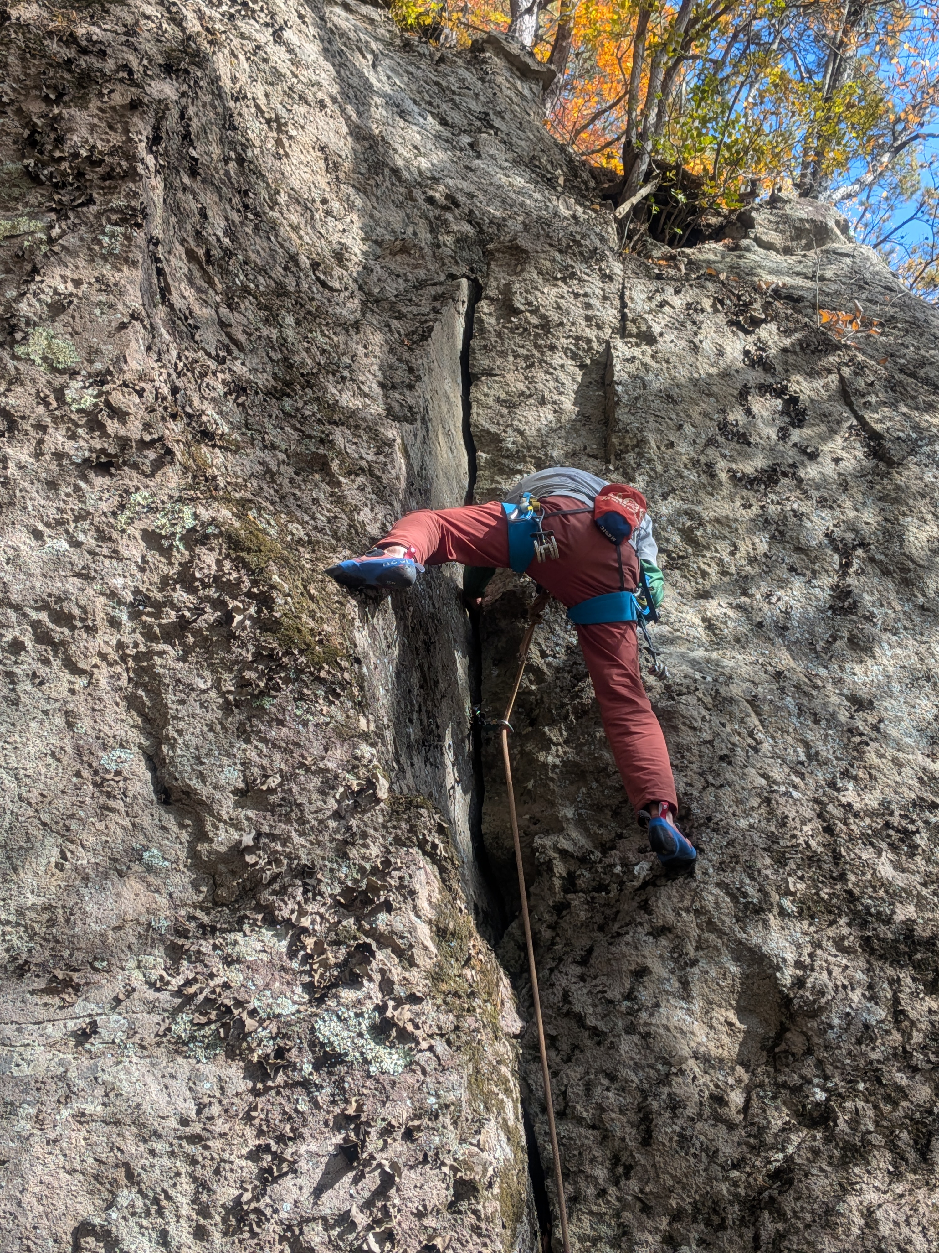スタートから1.0、0.75×2、2.0番のカムをクラックにプロテクション、クラックを抜けたテラスに立ってからボルト1本+終了点を設置