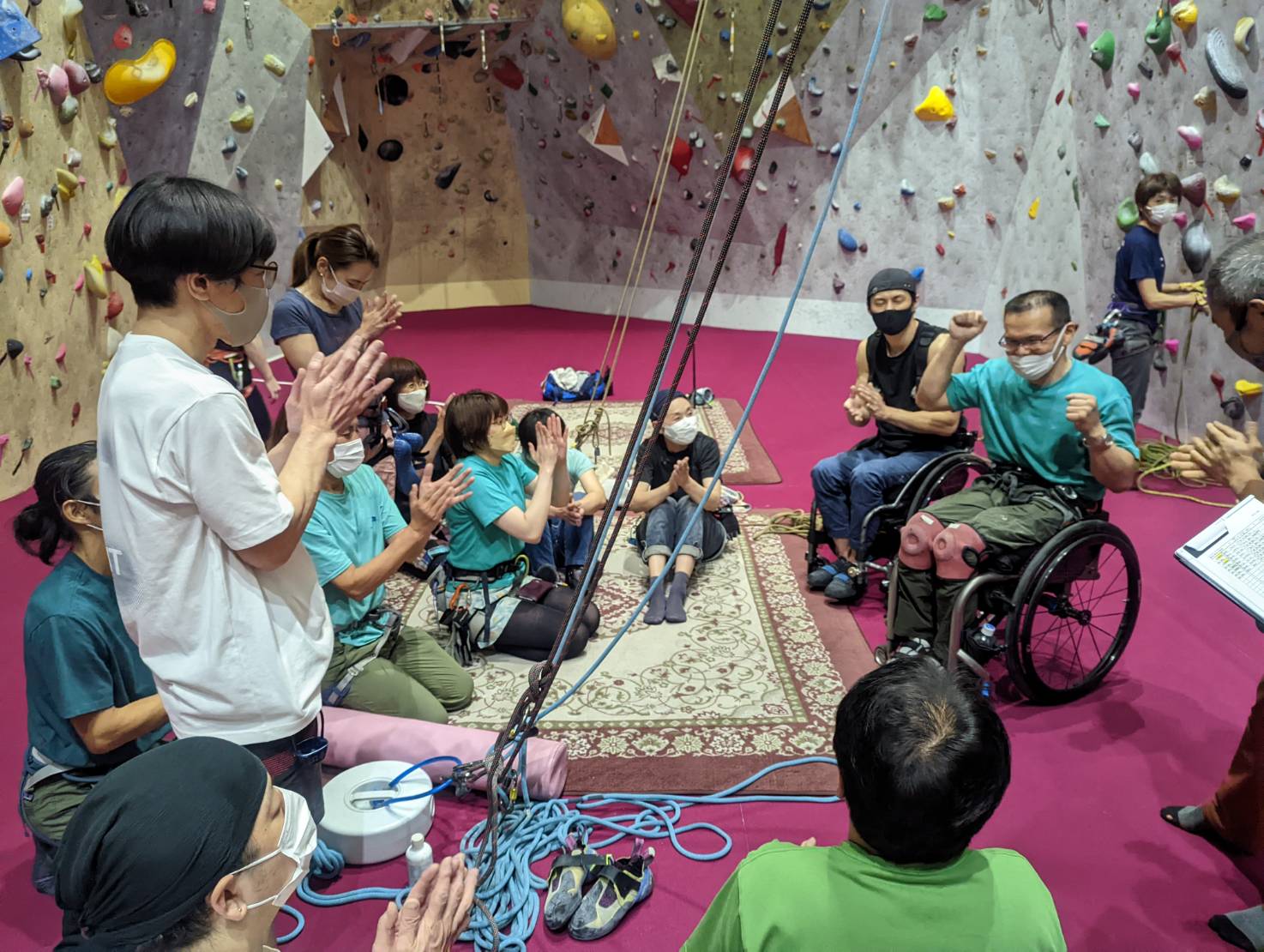 クライミング実践では、車椅子の方々は、腕と使えるすべての部位を駆使したキャンパシングにて、休息をはさみながら一本一本丁寧にトライし、なみすけさんから体の動かし方のコツを教わったり、久しぶりにロープを使ったクライミングスクールに参加された方は、自身のトライだけでなく、ビレイ(ロープの安全確保)の練習でビレイヤーをつとめるなど、終日スクールで目標としていた項目をひとつずつをやり切ることのできた1日となりました。
